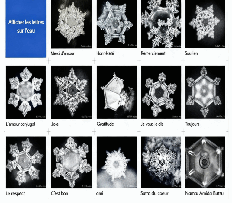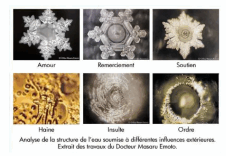 C’est au Japon, avec le Dr Masaru Emoto, qu’un coup de projecteur fut donnĂ© sur la possible sensibilitĂ© de l’eau Ă  l’intention humaine. Il s’est rendu cĂ©lĂšbre en photographiant des cristaux de glace formĂ©s Ă  partir d’eau exposĂ©e Ă  des mots, des sons ou mĂȘme des pensĂ©es bienveillantes. Selon lui, l’eau « rĂ©agit » : lorsqu’on lui adresse des paroles douces ou de la musique harmonieuse, ses cristaux semblent plus rĂ©guliers, presque artistiques. À l’inverse, des mots ou musiques agressifs produiraient des images dĂ©sordonnĂ©es.